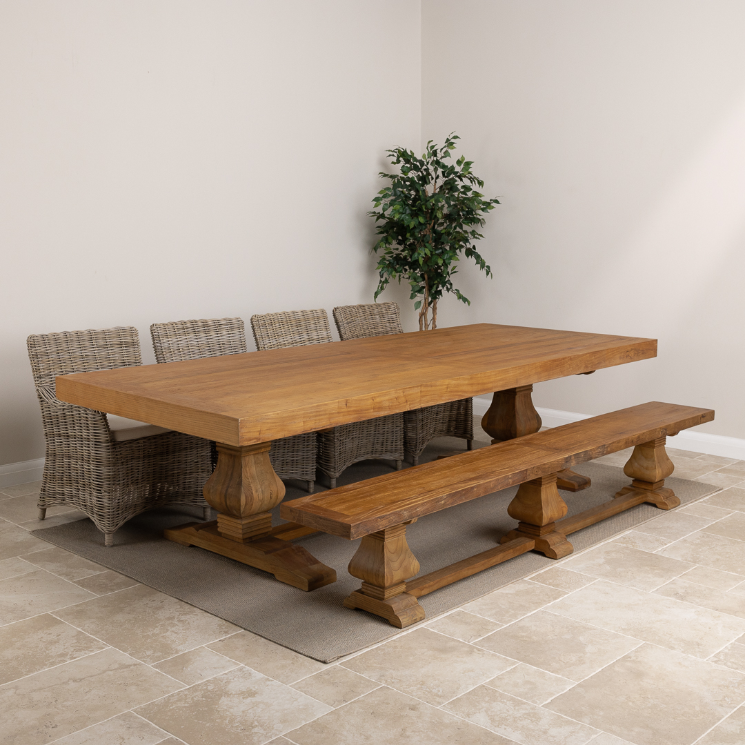 300cm Rectangular Reclaimed Elm Pedestal Indoor Dining Table with Elm Bench & 4 or 6 Natural Kubu Wicker ChairsIn stock