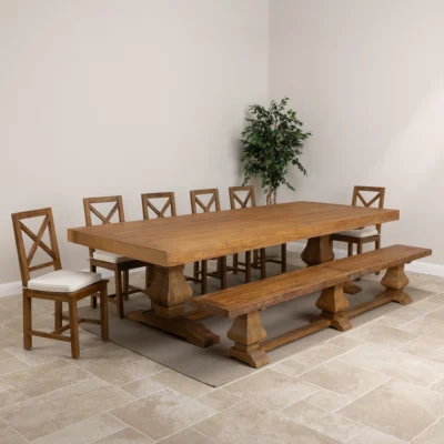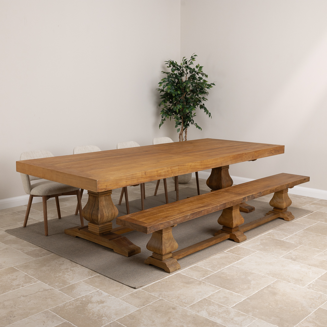 300cm Rectangular Reclaimed Elm Pedestal Indoor Dining Table with Elm Bench & 4 or 6 Etana ChairsIn stock