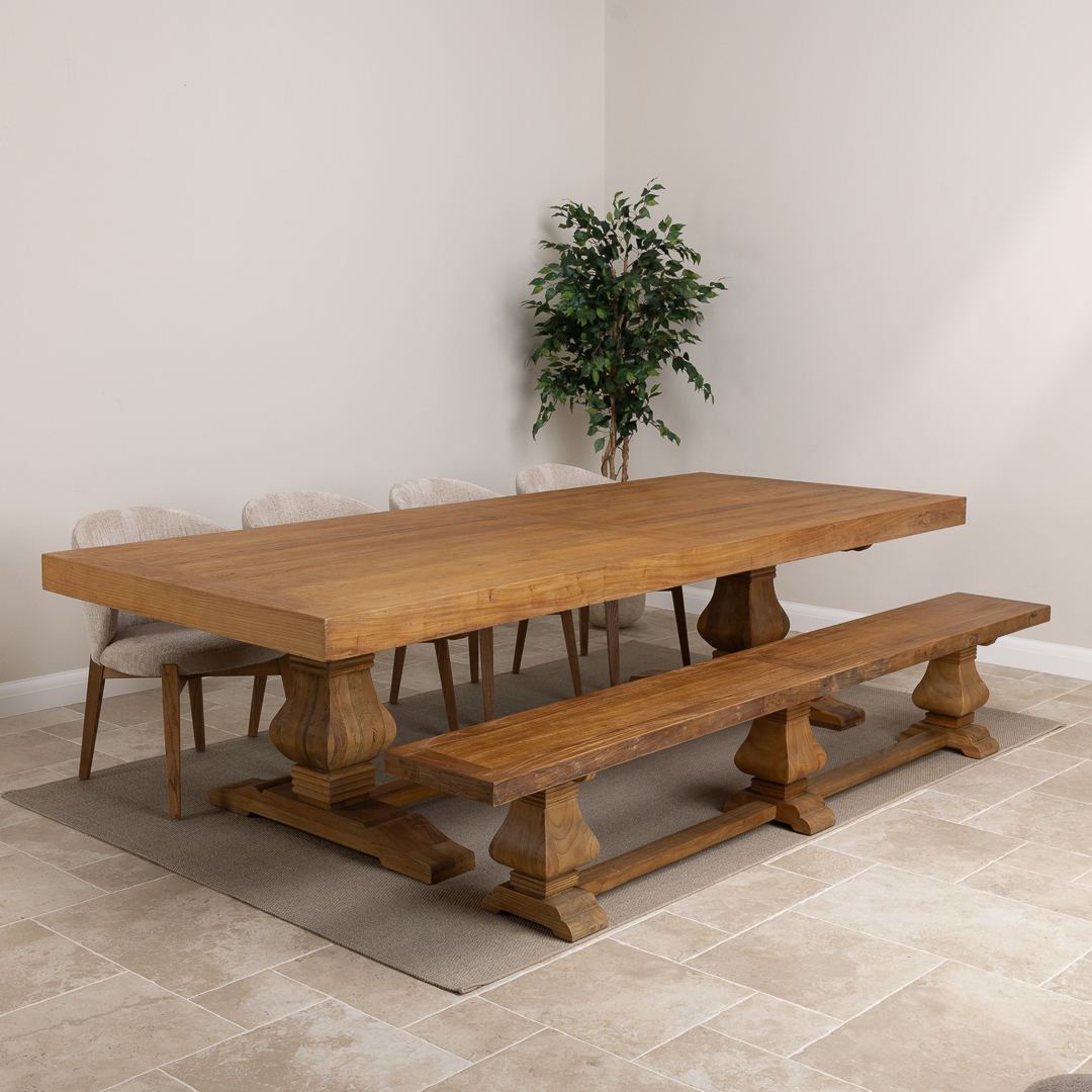 300cm Rectangular Reclaimed Elm Pedestal Indoor Dining Table with Elm Bench & 4 or 6 Upholstered Cove ChairsIn stock