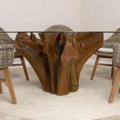 180cm Circular Reclaimed Teak Flute Root Indoor Dining Table with 6 Natural Kubu Wicker ChairsIn stock
