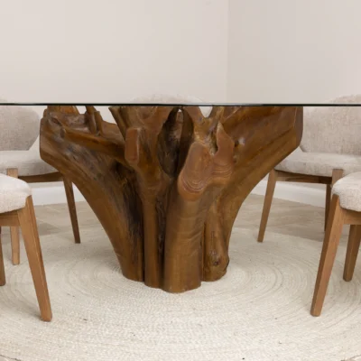 180cm Circular Reclaimed Teak Flute Root Indoor Dining Table with 6 Reclaimed Teak ChairsIn stock