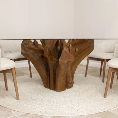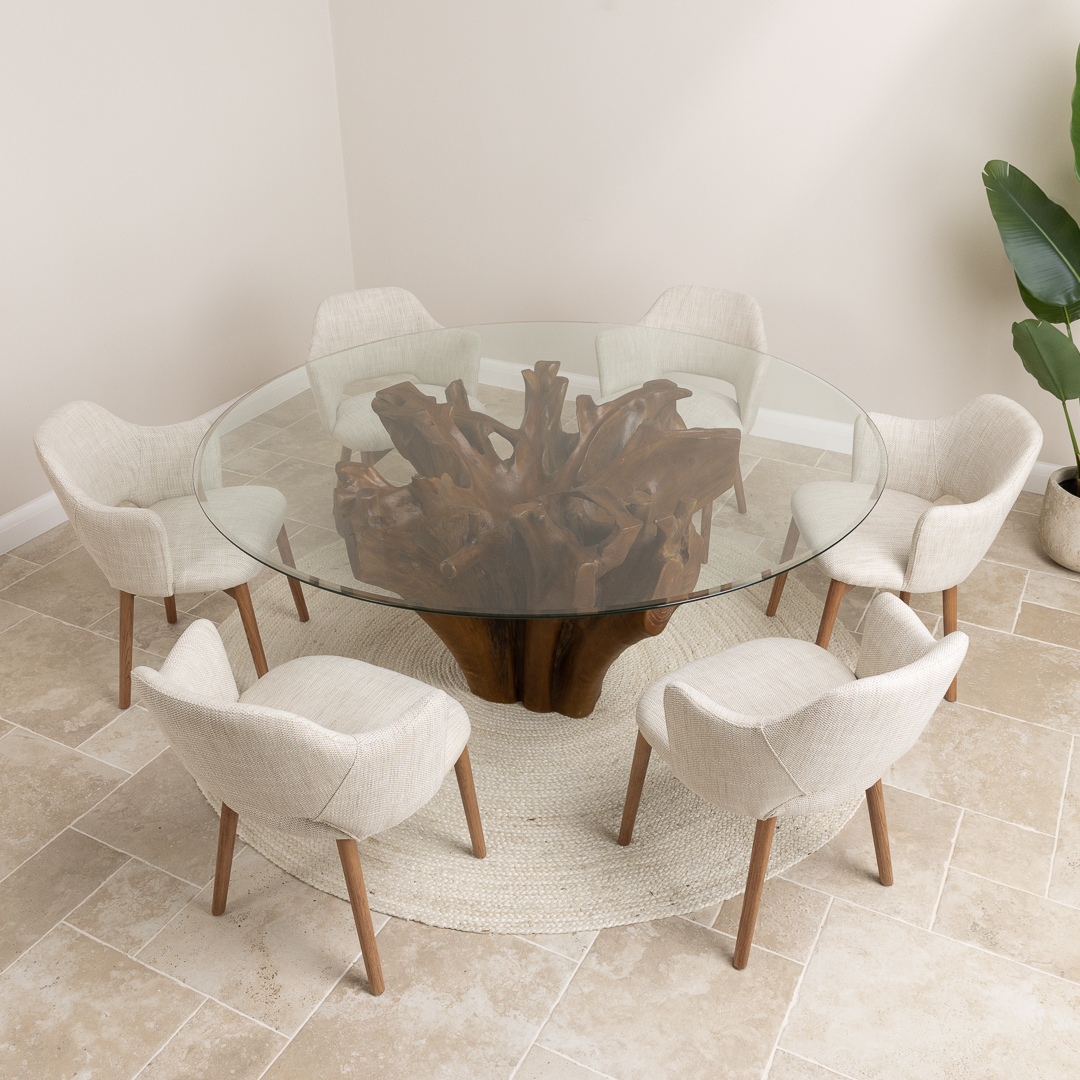 180cm Circular Teak Flute Root Dining Table with 6 Upholstered Cove ChairsIn stock
