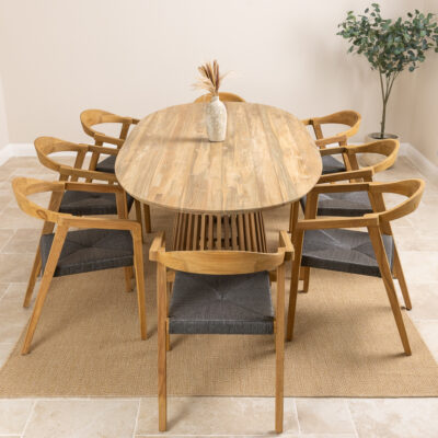 240cm Oval Teak Root Dining Table with 8 Recycled Fabric Wave ArmchairsIn stock
