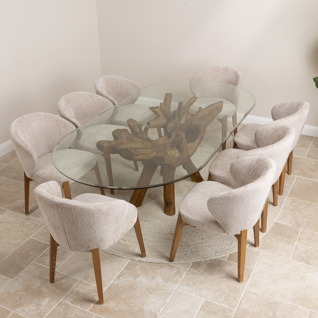 240cm Oval Teak Root Dining Table with 8 Upholstered Cove ChairsIn stock