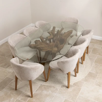 240cm Rectangular Teak Root Dining Table with 6 or 8 Upholstered Cove ChairsIn stock