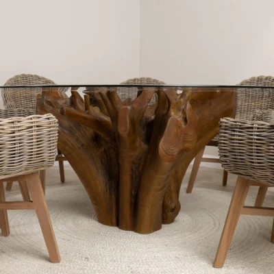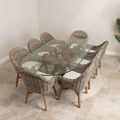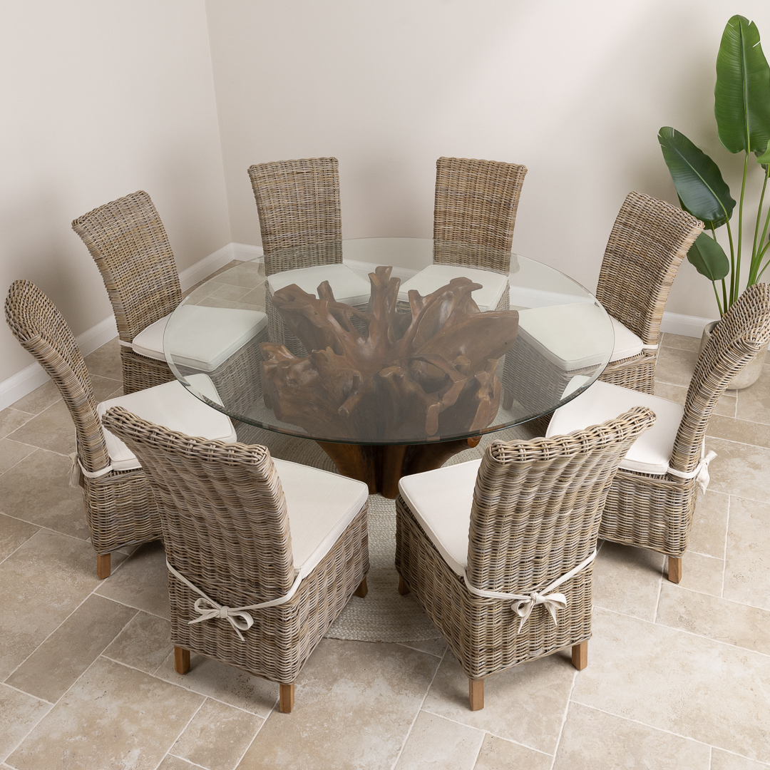 180cm Circular Reclaimed Teak Flute Root Indoor Dining Table with 8 Natural Kubu Wicker ChairsIn stock