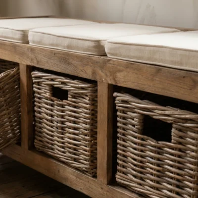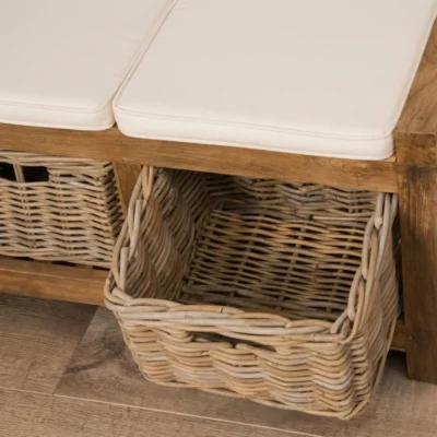 83cm Reclaimed Teak & Natural Kubu Wicker Hall Seat with 2 Kubu Wicker Baskets & 2 Natural Linen Seat PadsIn stock