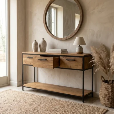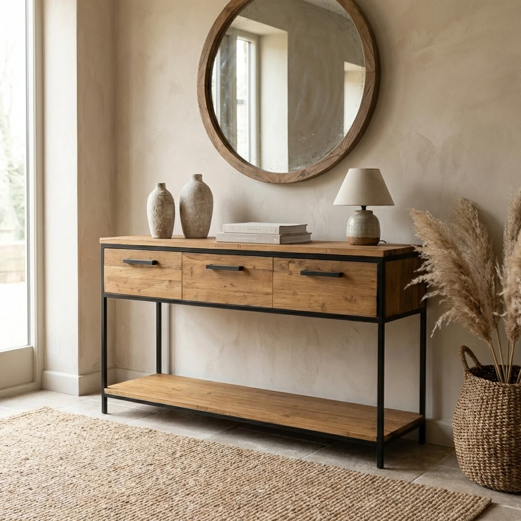 150cm Reclaimed Teak & Steel Hall Table with 3 Drawers & Shelf