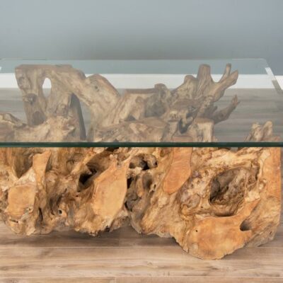 120cm x 80cm Rectangular Reclaimed Teak Root Cross Sectional Coffee Table with 10mm Toughened Safety Glass