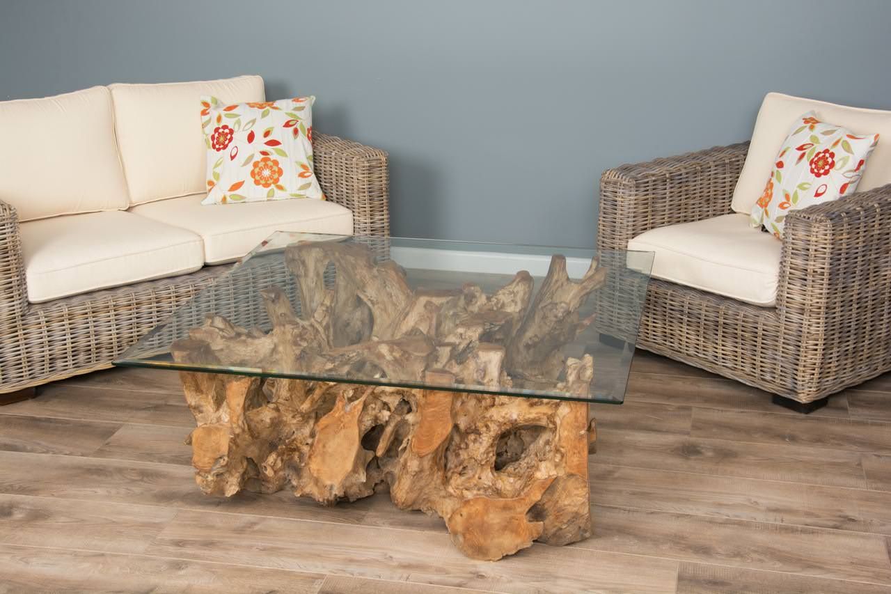 120cm Square Reclaimed Teak Root Cross Sectional Coffee Table with 10mm Toughened Safety Glass