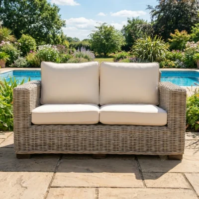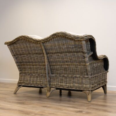 145cm Seater Natural Kubu Wicker Indoor/Outdoor Sofa with Natural Linen CushionsIn stock