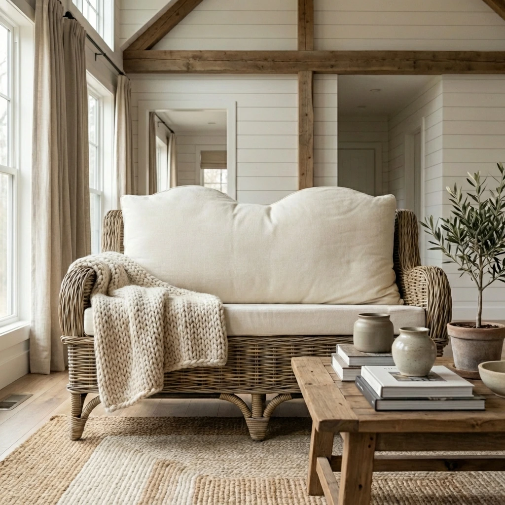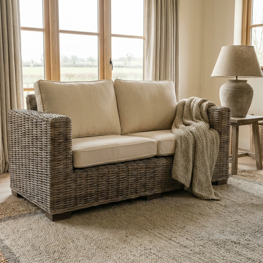 145cm Natural Kubu Wicker Indoor Sofa with Natural Linen CushionsIn stock