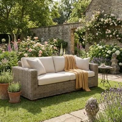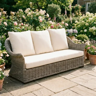 210cm Seater Natural Kubu Wicker Indoor/Outdoor Sofa with Natural Linen CushionsIn stock
