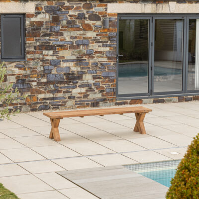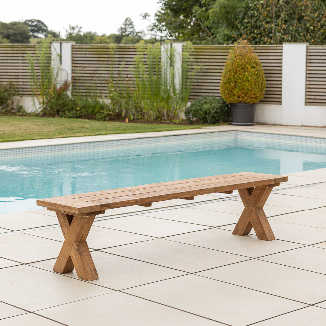 200cm Rectangular Natural Reclaimed Teak Outdoor Cross Leg Dining BenchIn stock