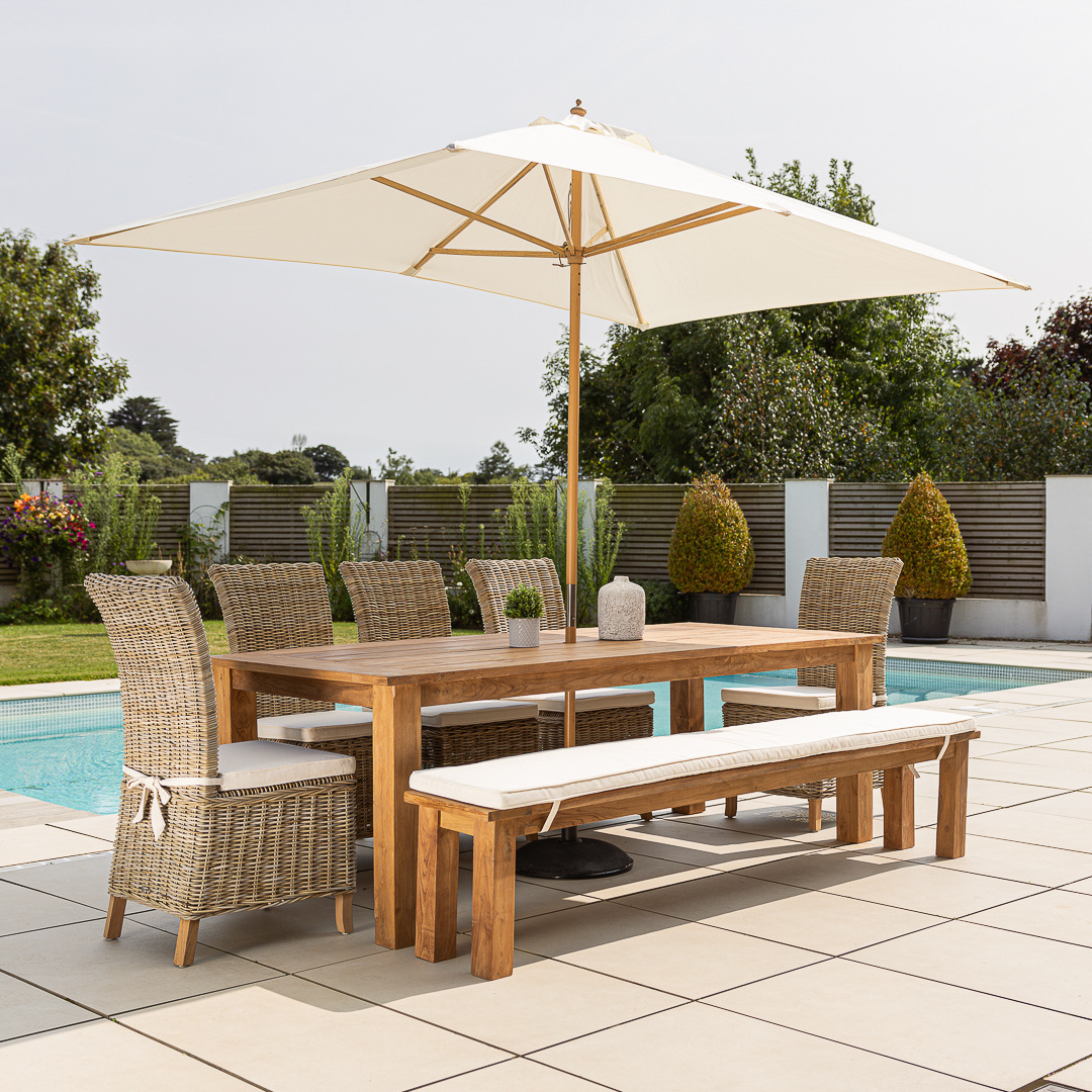 240cm Rectangular Natural Reclaimed Teak Straight Leg Outdoor Dining Table with Bench & 3 or 5 Natural Kubu Wicker ChairsIn stock