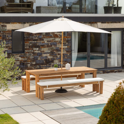 Each set features a beautifully crafted table with generous surface space for dining essentials, from tableware to decorative centrepieces. Many designs even include a convenient slot for integrating a parasol to provide much-needed shade on sunny days. You’ll also find an assortment of chairs and benches to comfortably seat up to eight guests. To amplify comfort, we recommend incorporating an arrangement of garden cushions to soften the space and add an extra dash of colour.