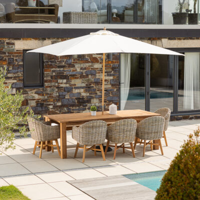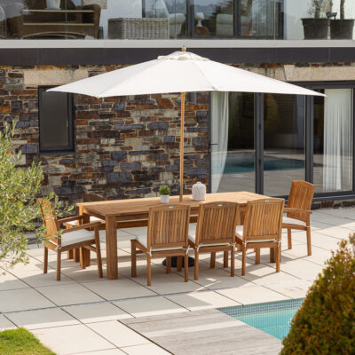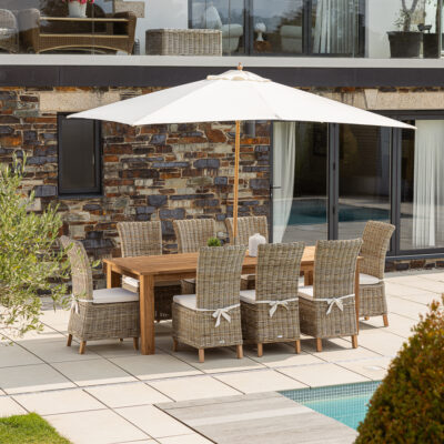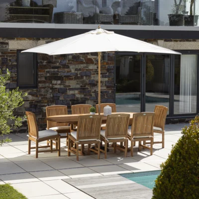 An 8-seater garden furniture set is a statement piece destined to become the main attraction of your outdoor space. Discover round, oval, and rectangular tables crafted from exquisite Teak and Swedish Redwood. Each table is complemented with matching wooden seating, benches, or charming wicker chairs.