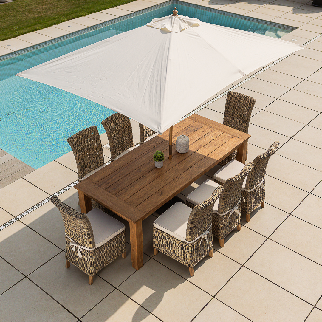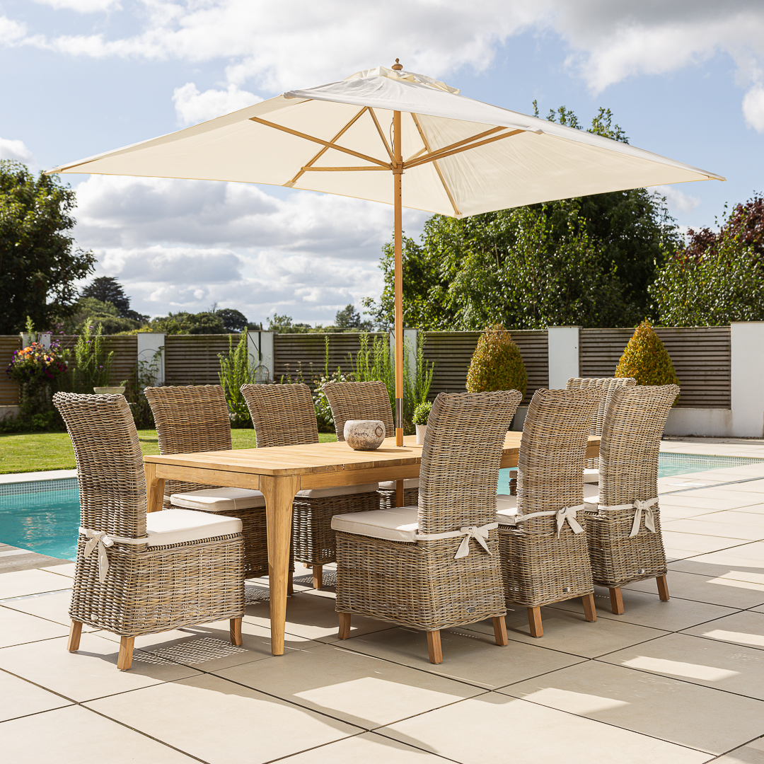 240cm Rectangular Natural Reclaimed Teak Straight Leg Outdoor Dining Table with 6 or 8 Natural Kubu Wicker ChairsIn stock