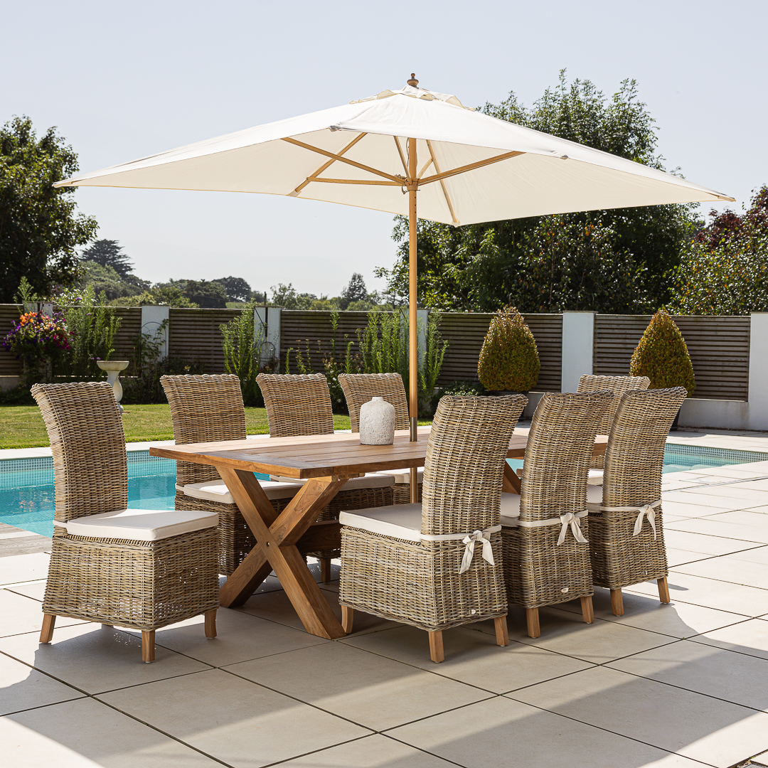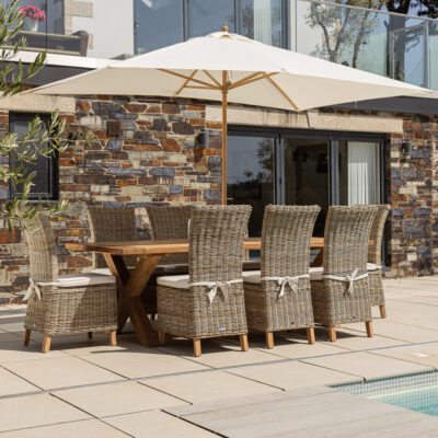 240cm Rectangular Natural Reclaimed Teak Cross Leg Outdoor Dining Table with 6 or 8 Natural Kubu Wicker ChairsIn stock