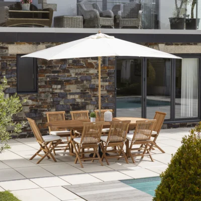 180cm - 240cm Oval Certified Teak Extending Outdoor Dining Table with 6 or 8 Cora Teak Folding ChairsIn stock