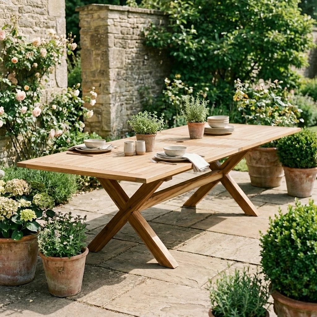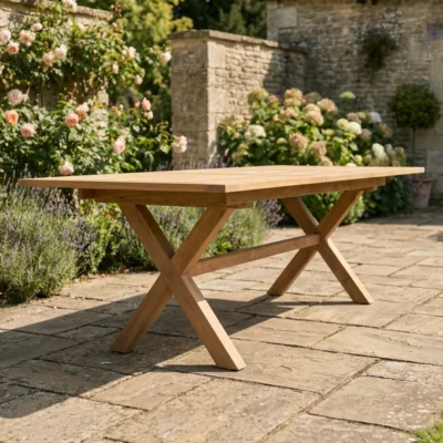 180cm - 240cm Certified Teak Rectangular Extending Cross Leg Dining Table with Butterfly Folding LeavesIn stock