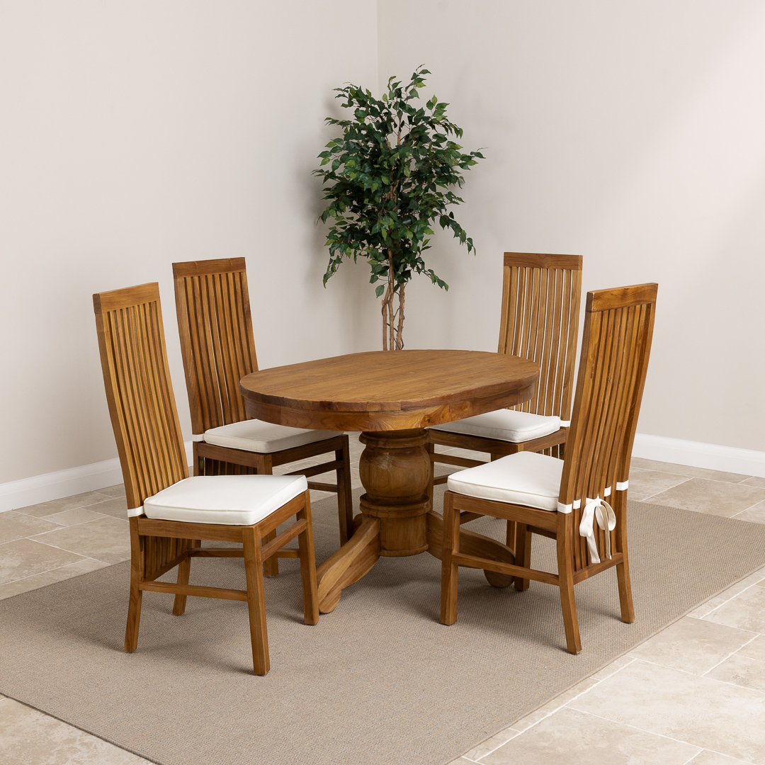 120cm Oval Rustic Reclaimed Teak Pedestal Indoor Dining Table with 4 Reclaimed Teak ChairsIn stock