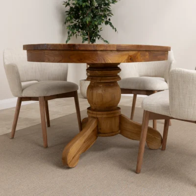 120cm Circular Rustic Reclaimed Teak Pedestal Indoor Dining Table with 4 Reclaimed Teak ChairsIn stock