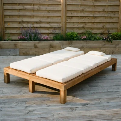 Two Certified Teak Outdoor Sun Loungers with Side Table & Free CushionsIn stock