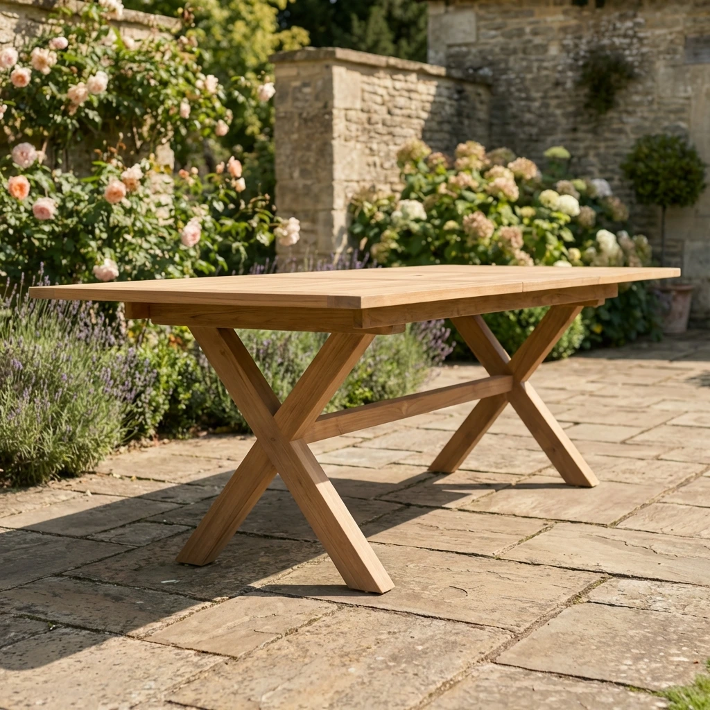 180cm - 240cm Certified Teak Single Extending Cross Leg Outdoor Dining Table with 6 or 8 Marley Teak Stacking ChairsIn stock