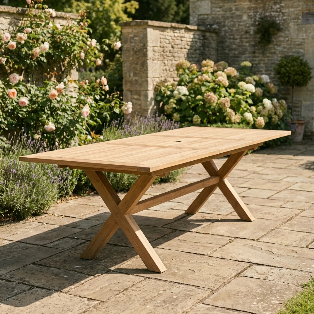 240cm - 320cm Certified Teak Double Extending Cross Leg Outdoor Dining Table with 10 or 12 Scandi ArmchairsIn stock
