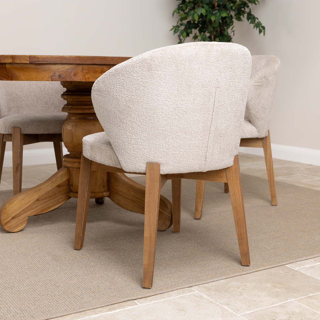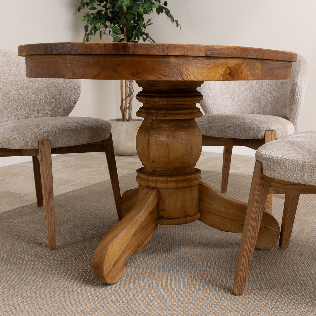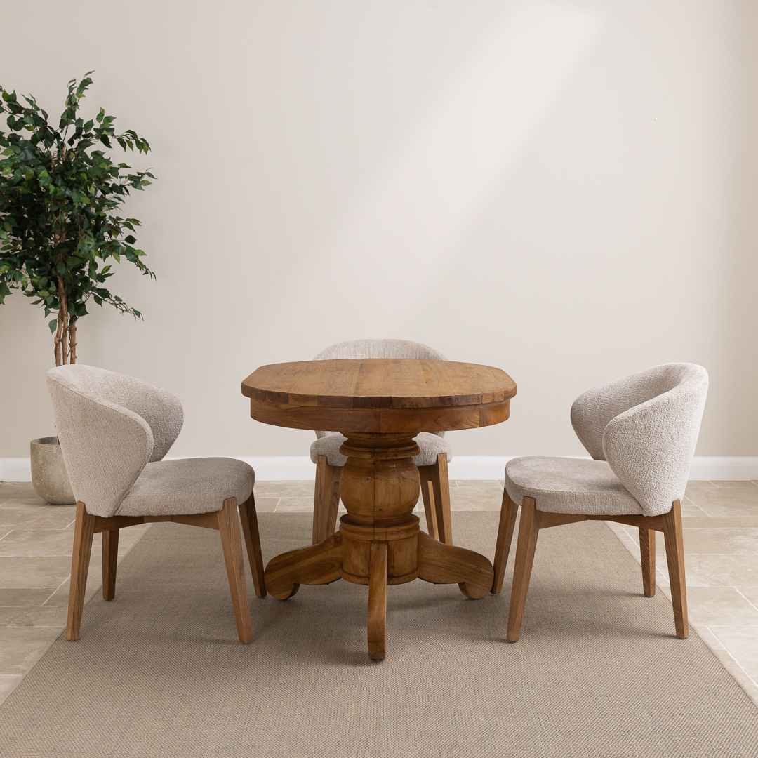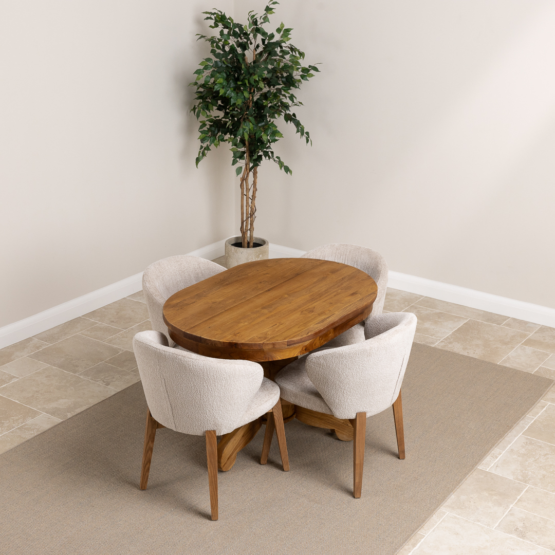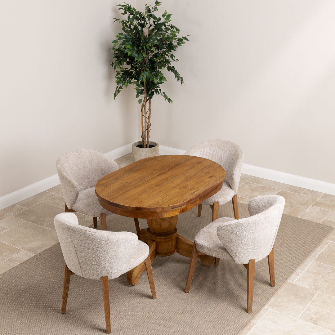 120cm Oval Rustic Reclaimed Teak Pedestal Indoor Dining Table with 4 Upholstered Cove Chairs