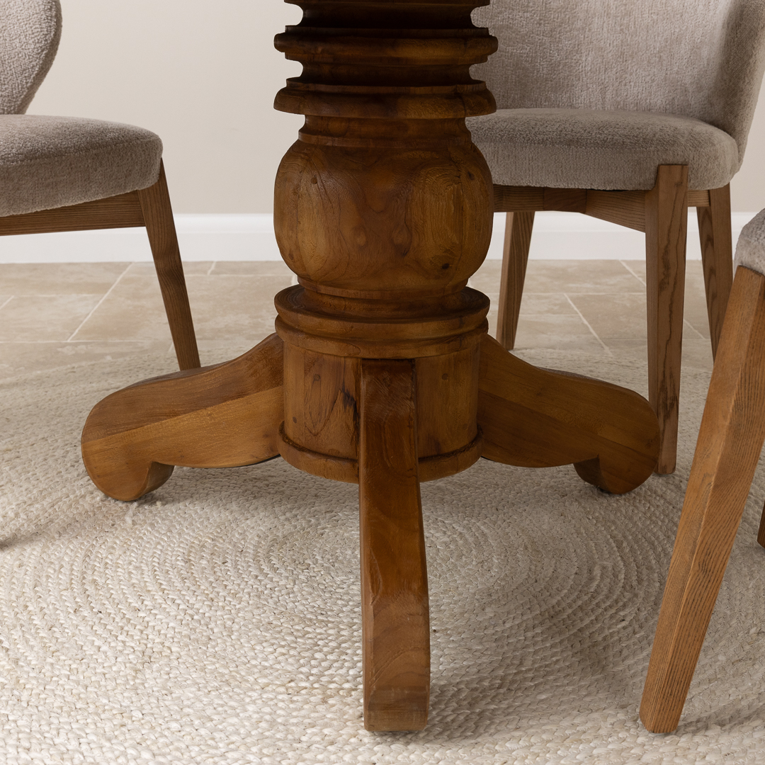 120cm Circular Rustic Reclaimed Teak Pedestal Indoor Dining Table with 4 Upholstered Cove ChairsIn stock