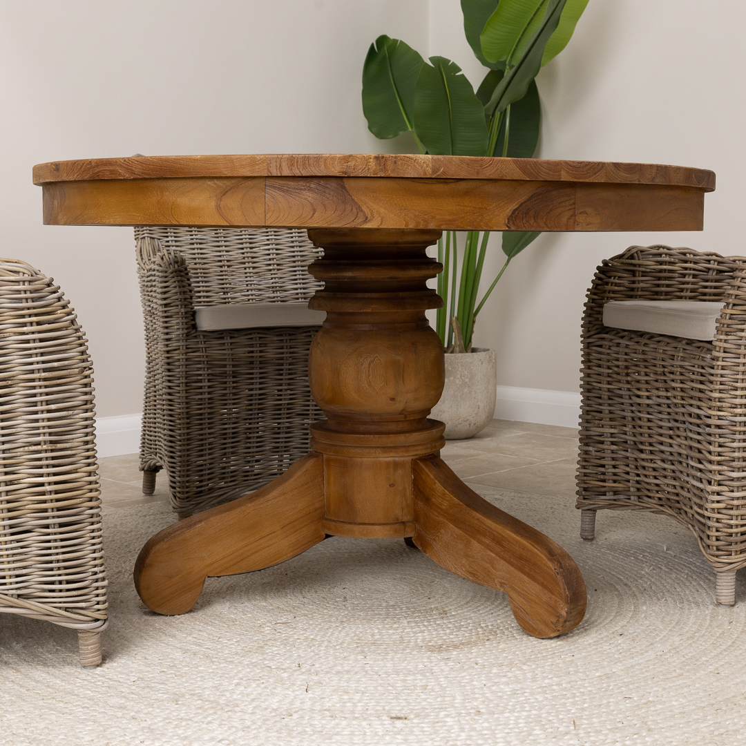 120cm Circular Rustic Reclaimed Teak Pedestal Indoor Dining Table with 4 Natural Kubu Wicker ChairsIn stock