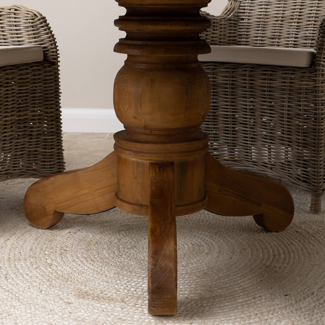 120cm Circular Rustic Reclaimed Teak Pedestal Indoor Dining Table with 4 Reclaimed Teak ChairsIn stock