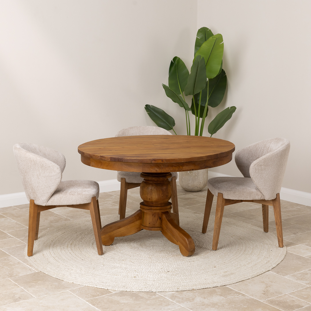100cm Circular Rustic Reclaimed Teak Pedestal Indoor Dining Table with 4 Upholstered Cove ChairsIn stock