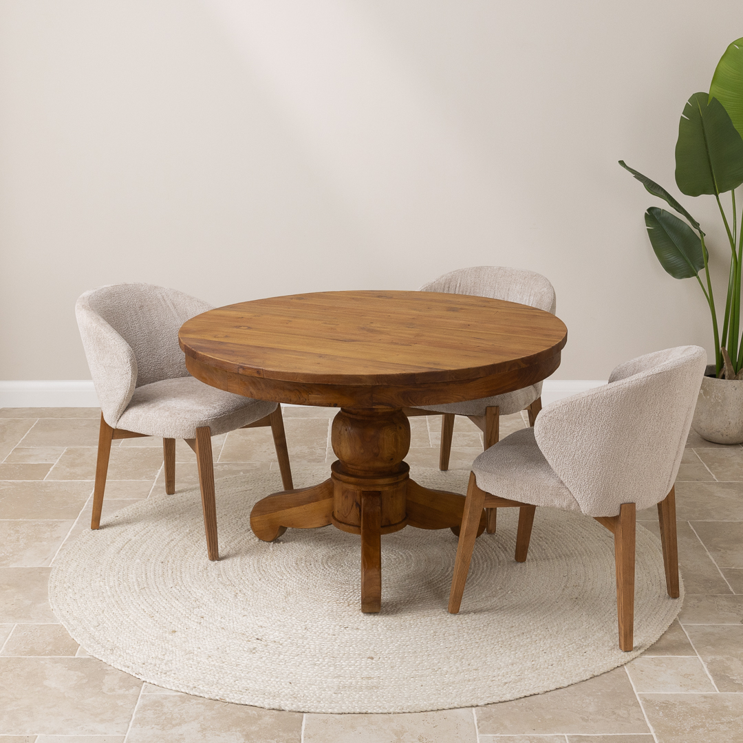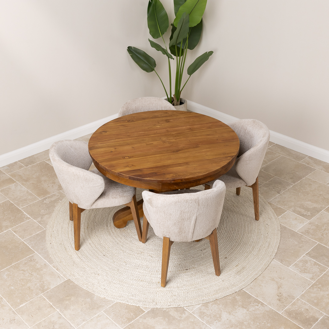 120cm Circular Rustic Reclaimed Teak Pedestal Indoor Dining Table with 4 Upholstered Cove Chairs