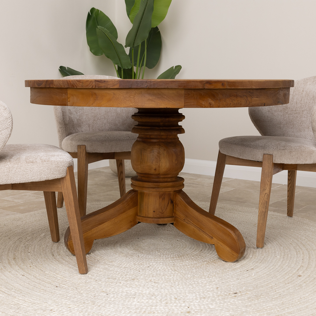 120cm Circular Rustic Reclaimed Teak Pedestal Indoor Dining Table with 4 Reclaimed Teak ChairsIn stock