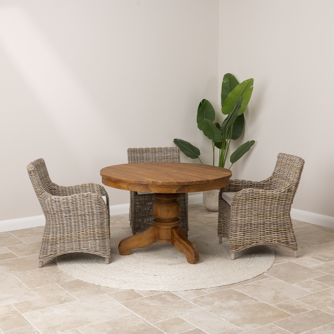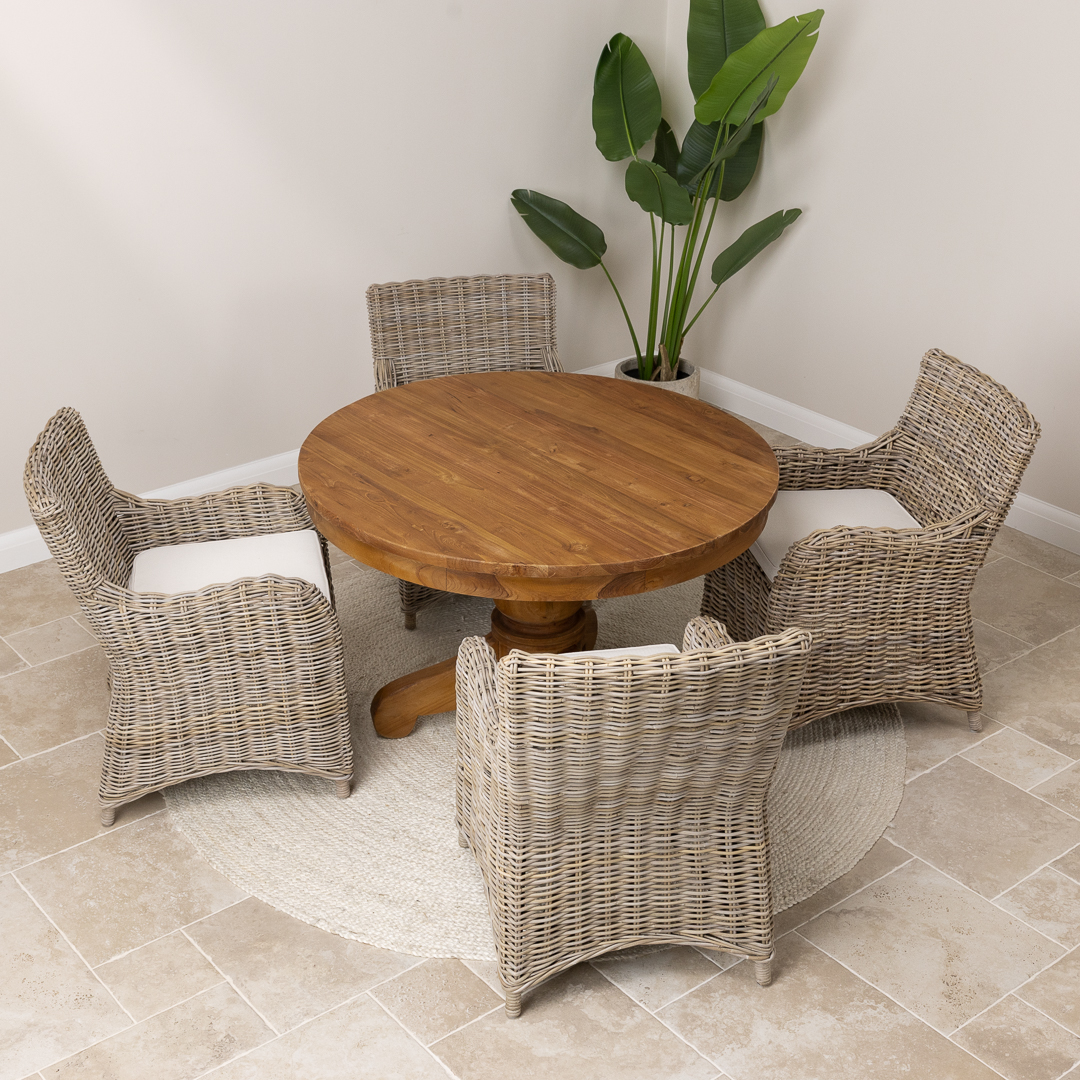 120cm Circular Rustic Reclaimed Teak Pedestal Indoor Dining Table with 4 Natural Kubu Wicker Chairs