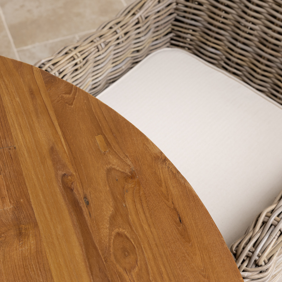 100cm Circular Rustic Reclaimed Teak Pedestal Indoor Dining Table with 4 Natural Kubu Wicker ChairsIn stock