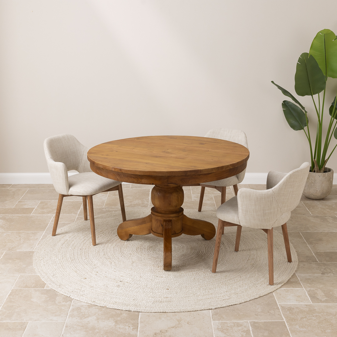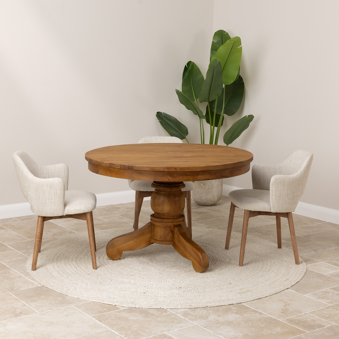120cm Circular Rustic Reclaimed Teak Pedestal Indoor Dining Table with 4 Upholstered Cove ChairsIn stock