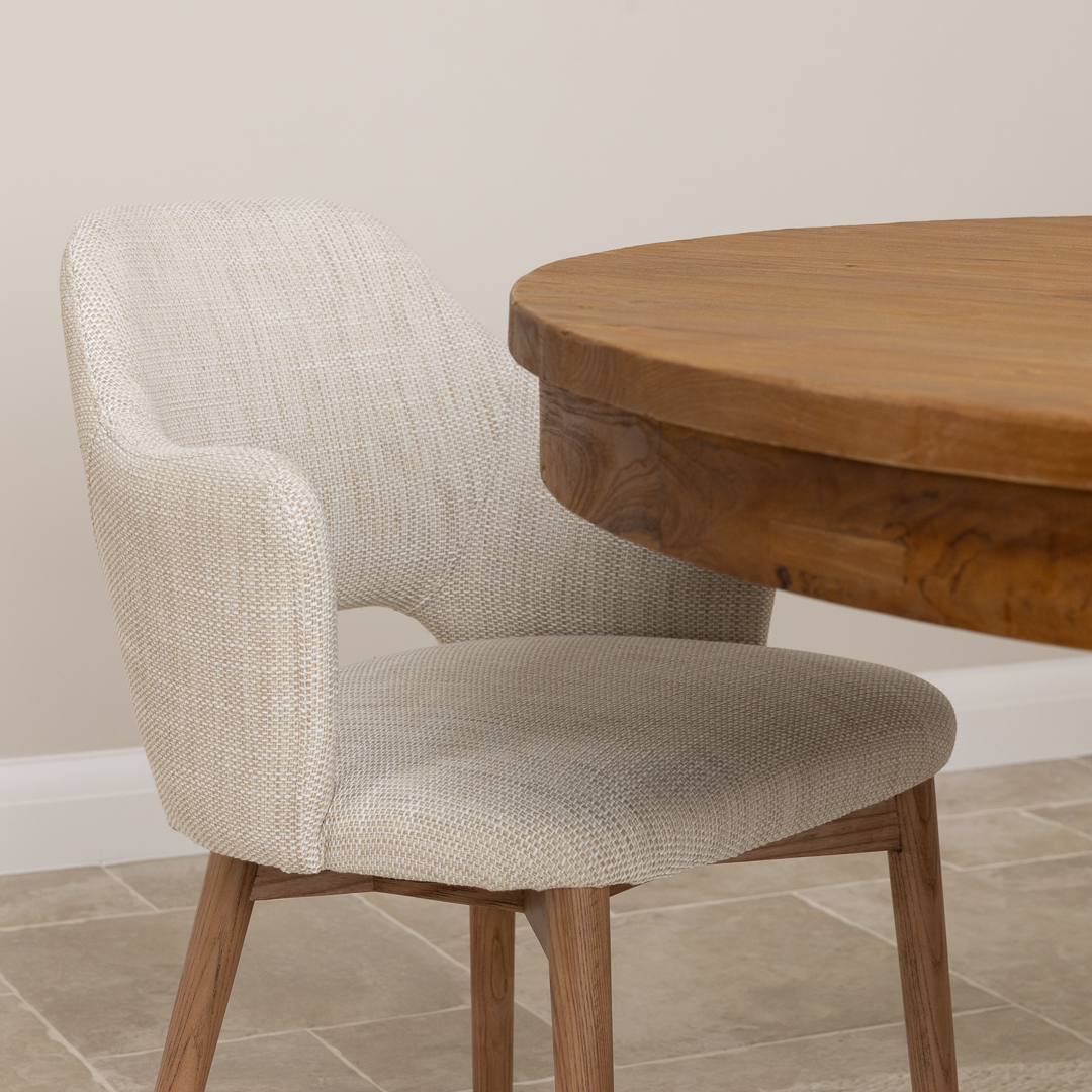 150cm Circular Rustic Reclaimed Teak Pedestal Indoor Dining Table with 6 Upholstered Cove ChairsIn stock
