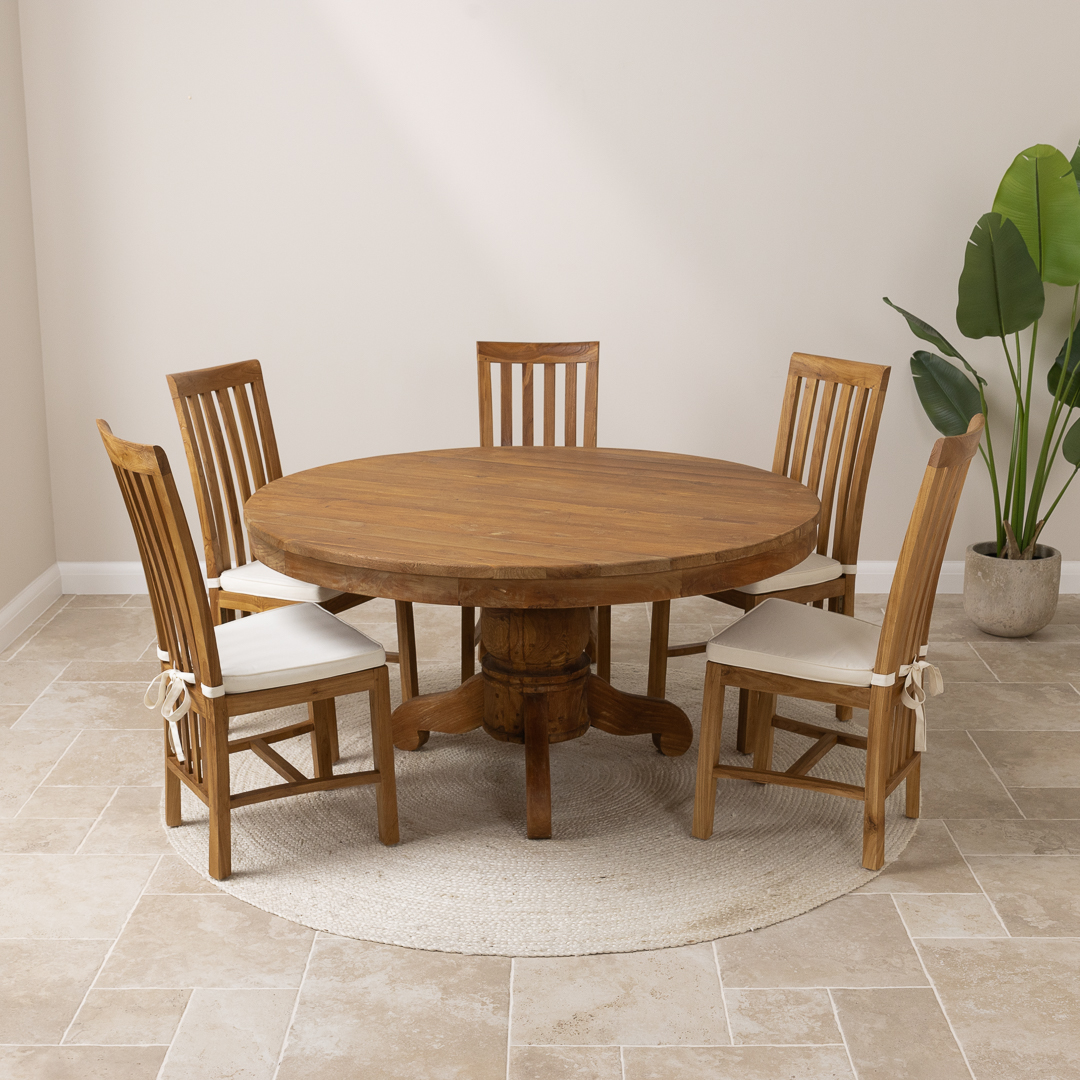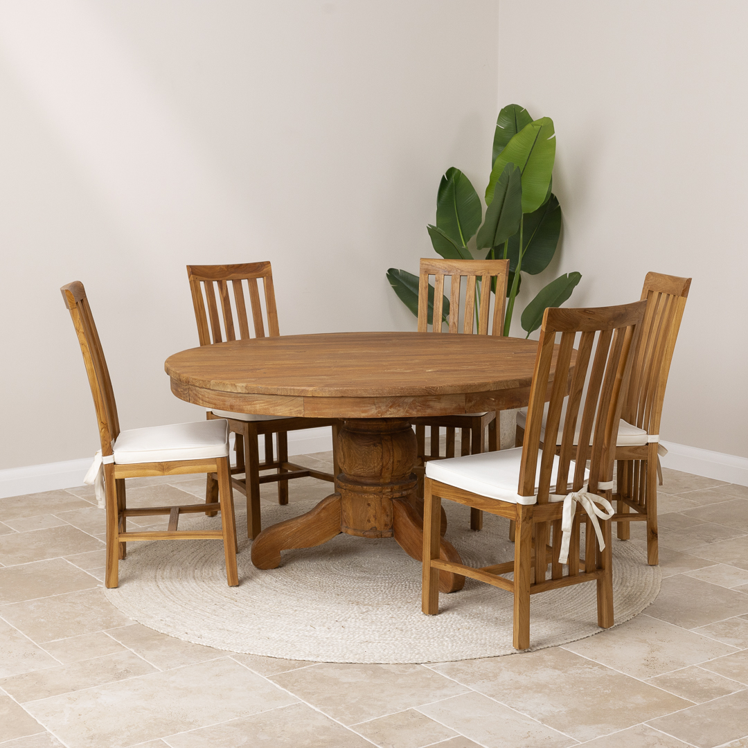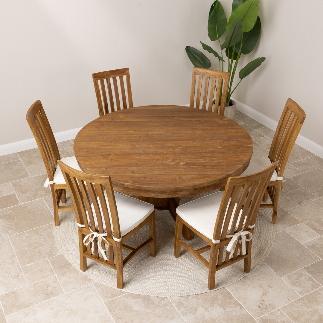 150cm Circular Rustic Reclaimed Teak Pedestal Indoor Dining Table with 6 Reclaimed Teak Chairs