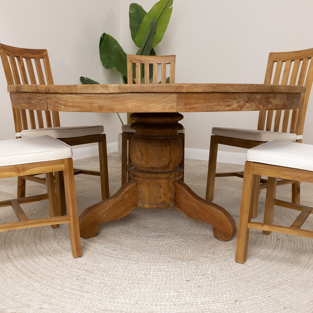 120cm Circular Rustic Reclaimed Teak Pedestal Indoor Dining Table with 4 Reclaimed Teak ChairsIn stock