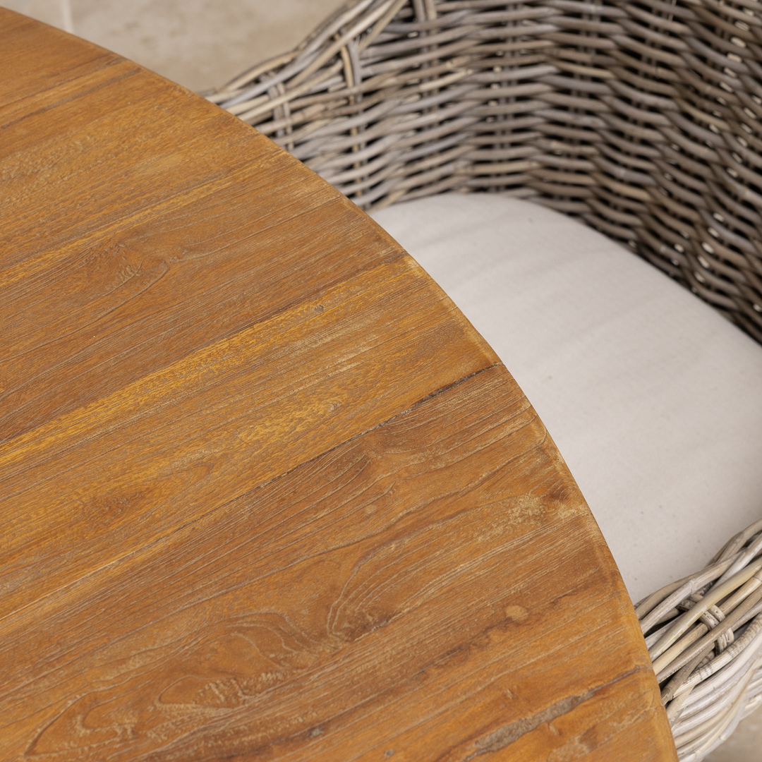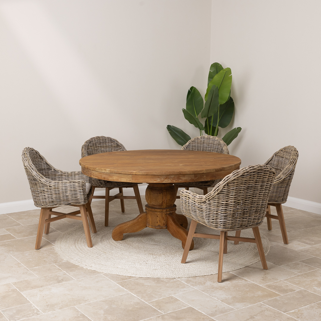 120cm Circular Rustic Reclaimed Teak Pedestal Indoor Dining Table with 4 Natural Kubu Wicker ChairsIn stock