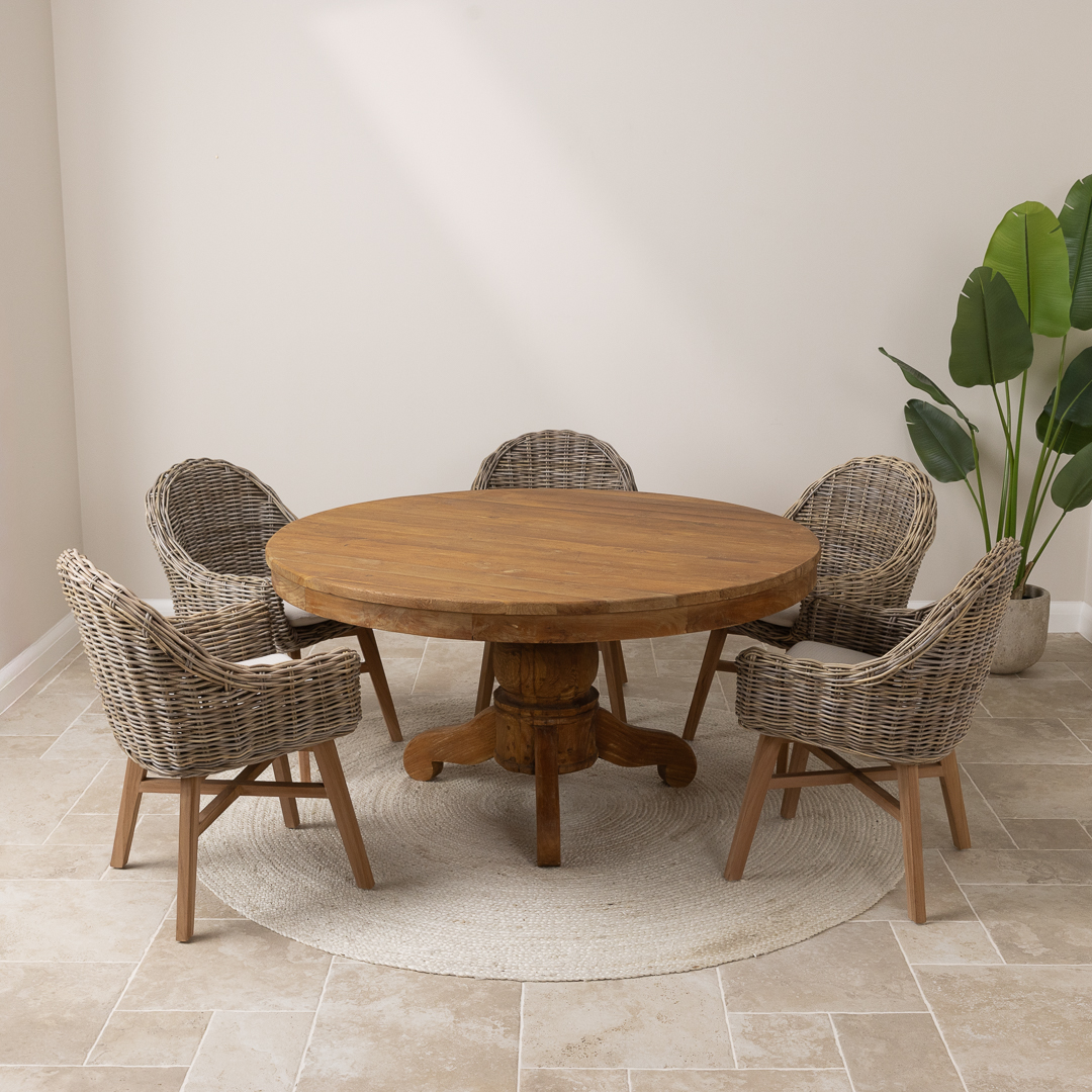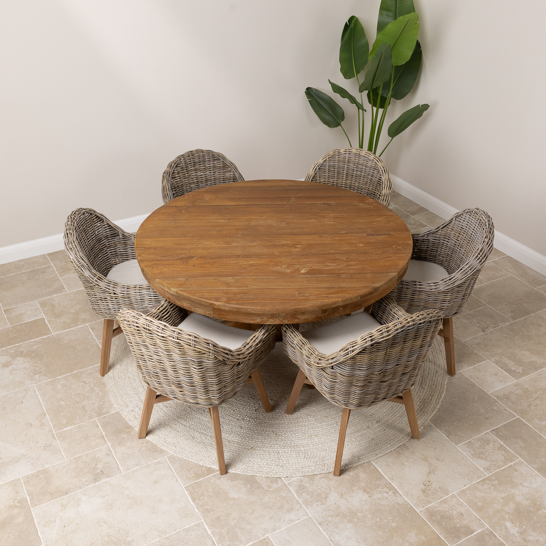150cm Circular Rustic Reclaimed Teak Pedestal Indoor Dining Table with 6 Natural Kubu Wicker ChairsIn stock