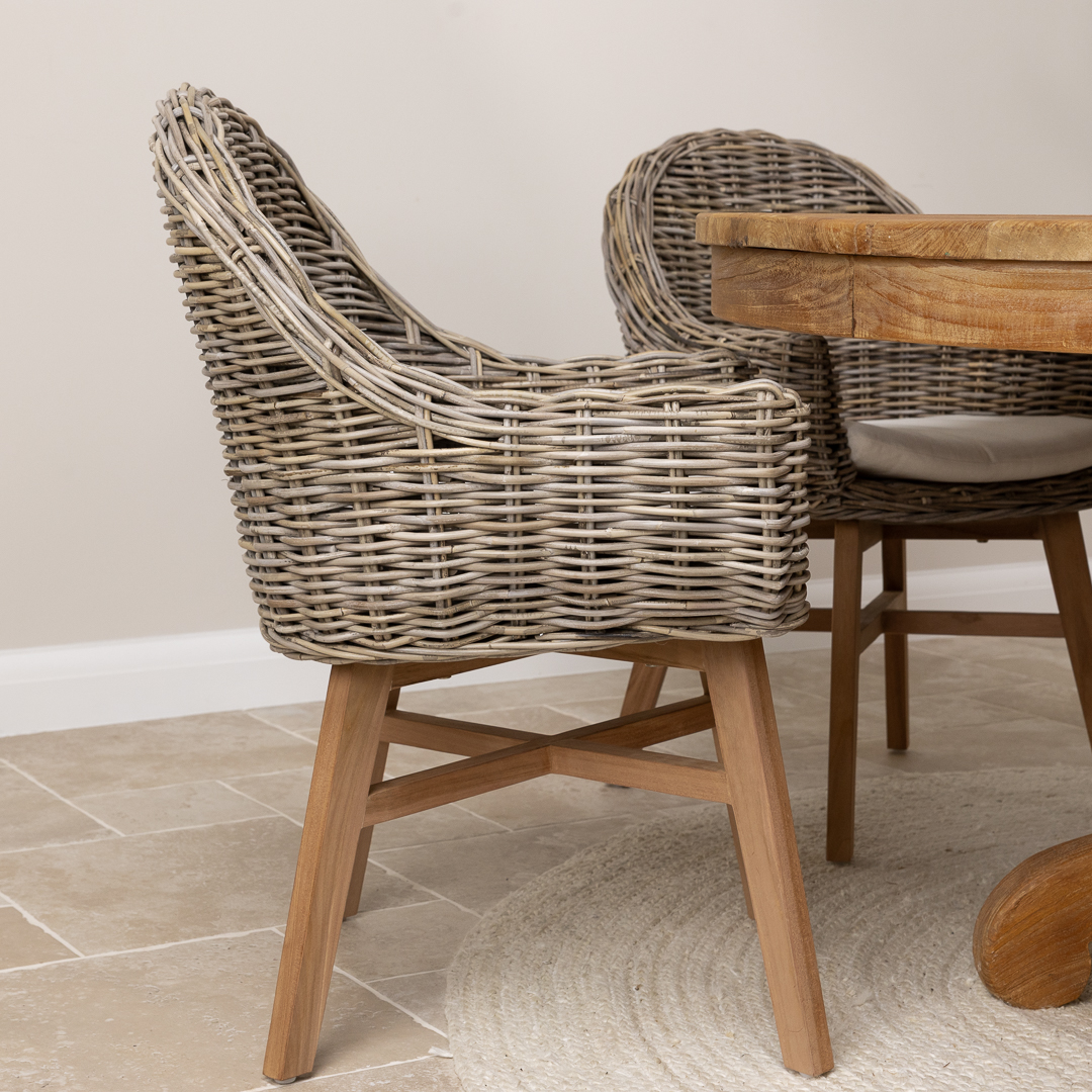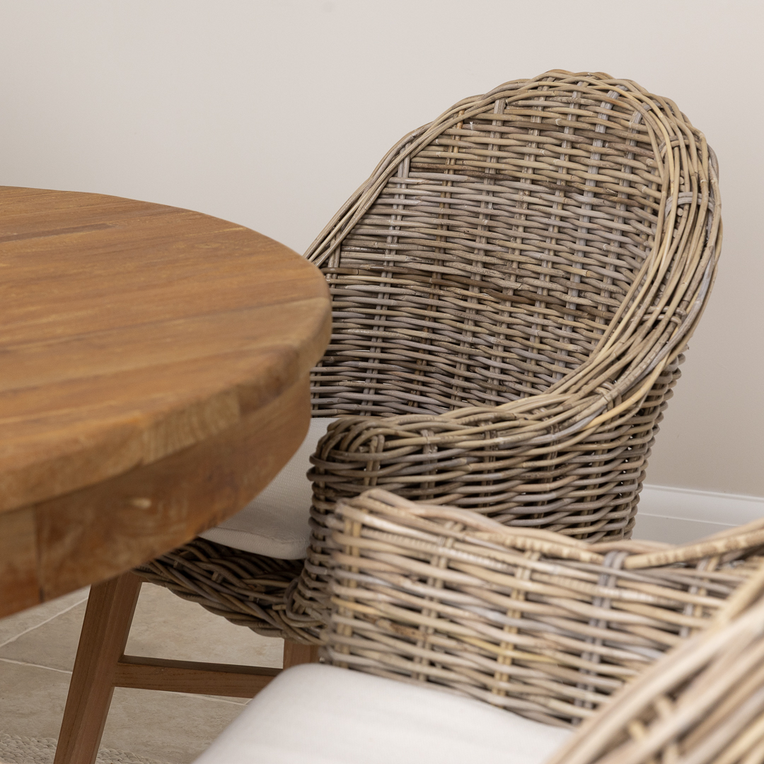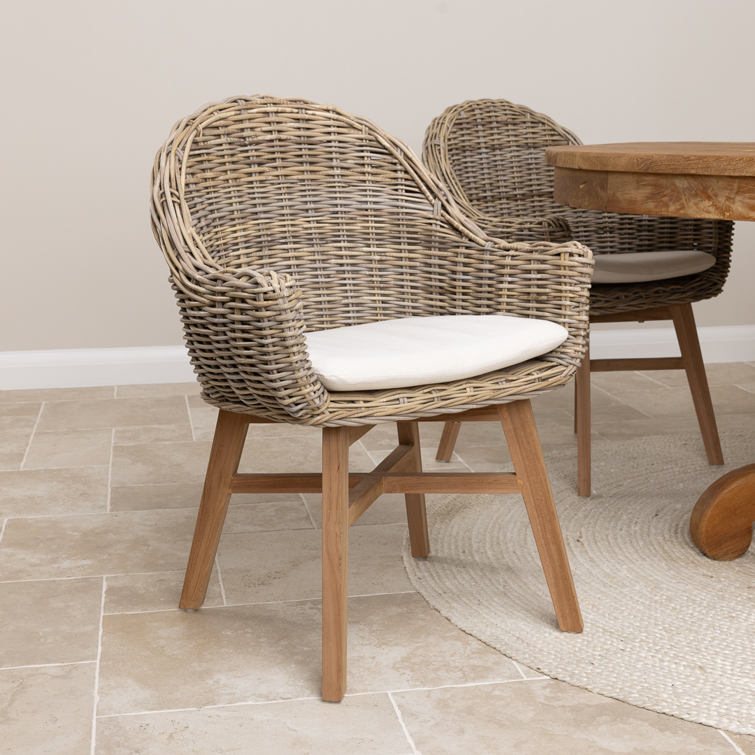 Natural Kubu Wicker Indoor/Outdoor Scroll Dining Armchair with Natural Linen CushionIn stock