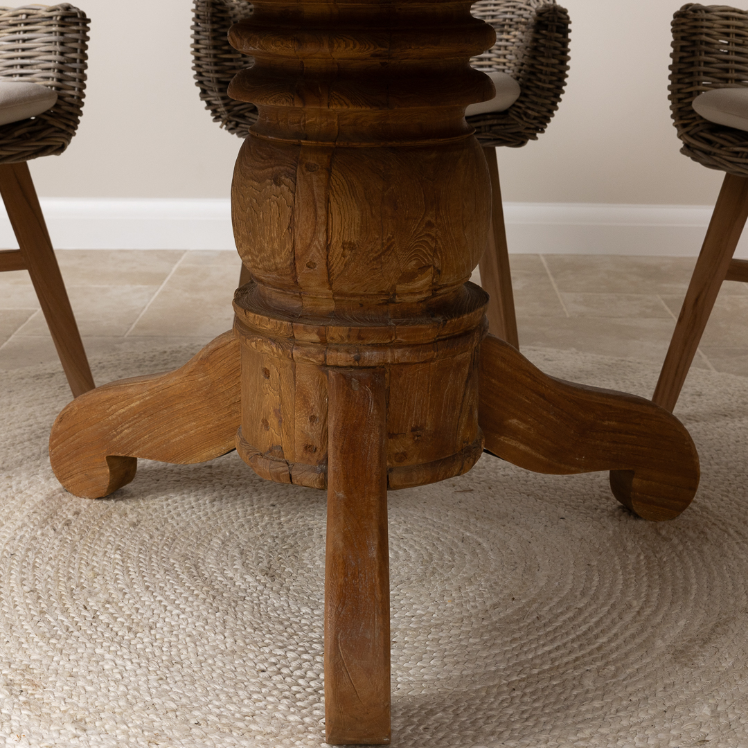 120cm Circular Rustic Reclaimed Teak Pedestal Indoor Dining Table with 4 Reclaimed Teak ChairsIn stock