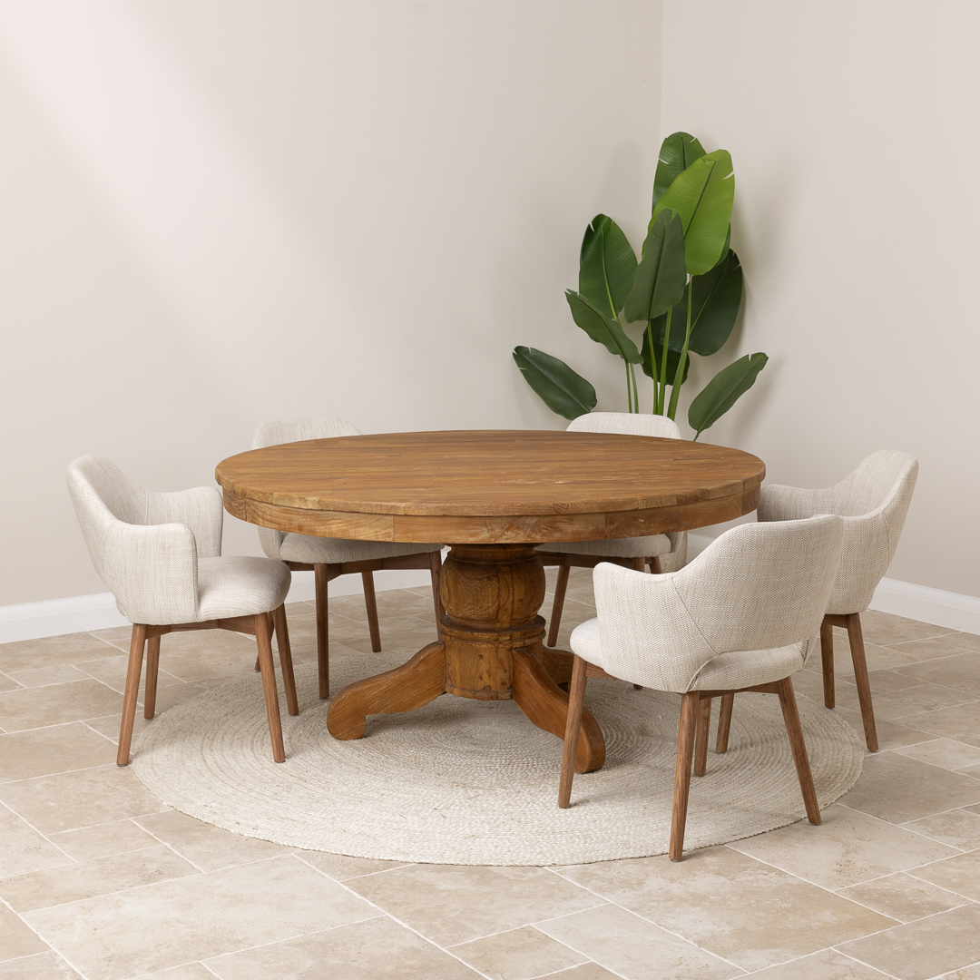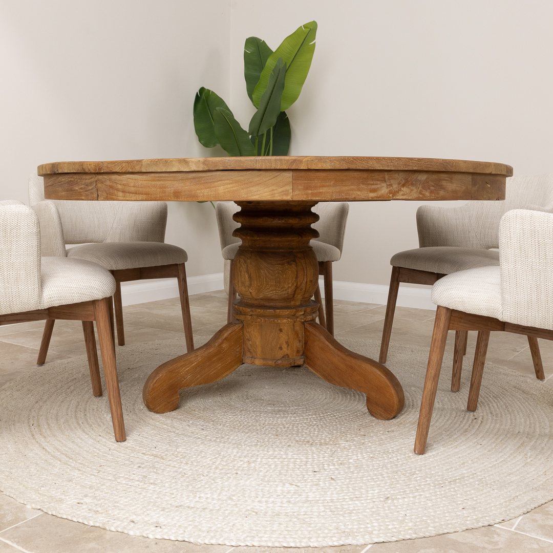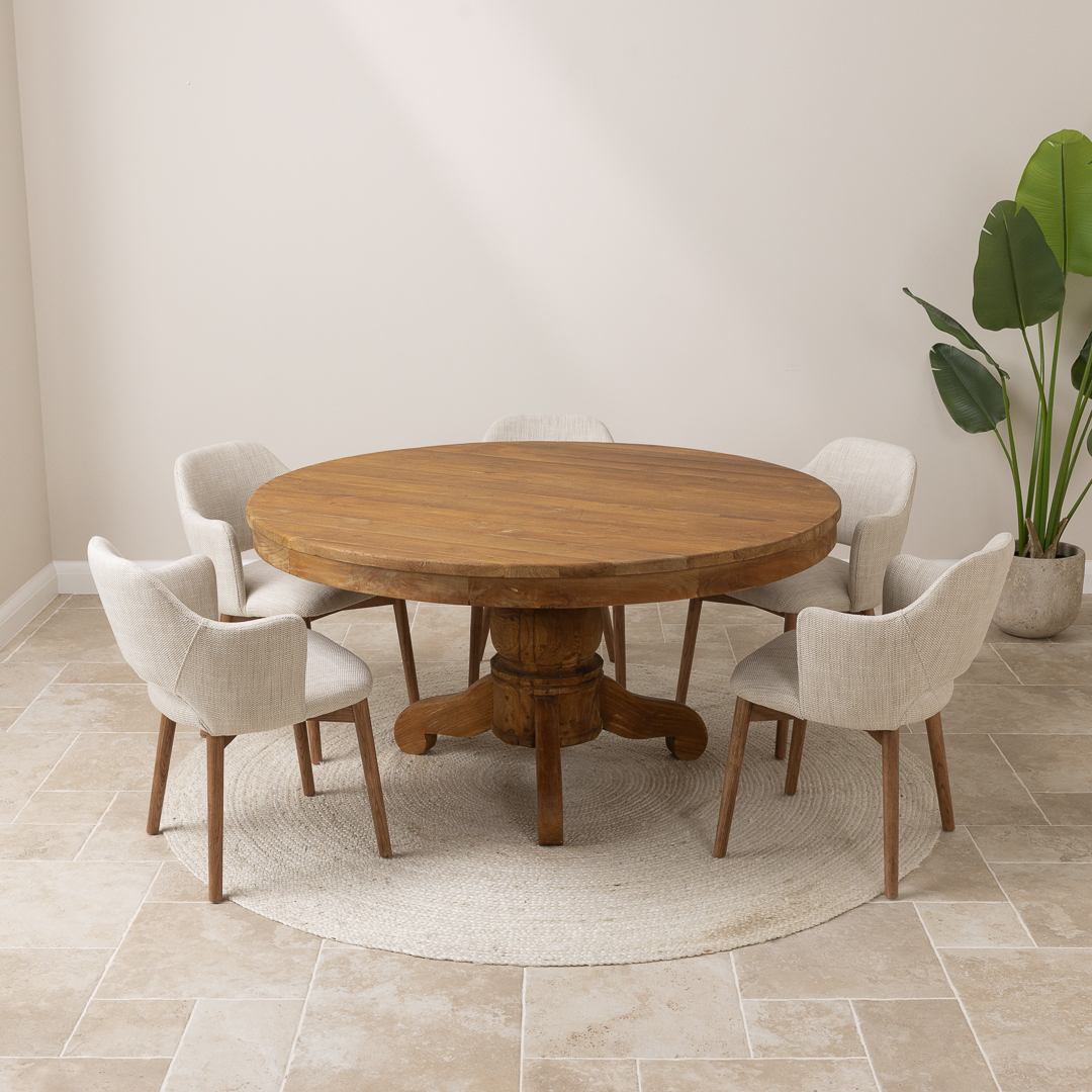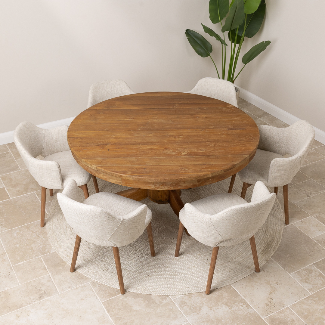 150cm Circular Rustic Reclaimed Teak Pedestal Indoor Dining Table with 6 Upholstered Cove ChairsIn stock