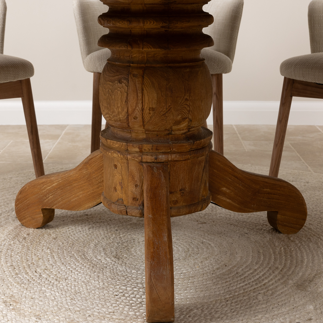 120cm Circular Rustic Reclaimed Teak Pedestal Indoor Dining Table with 4 Upholstered Cove ChairsIn stock