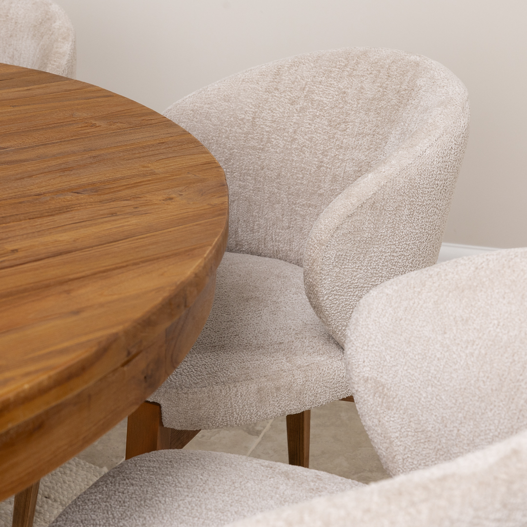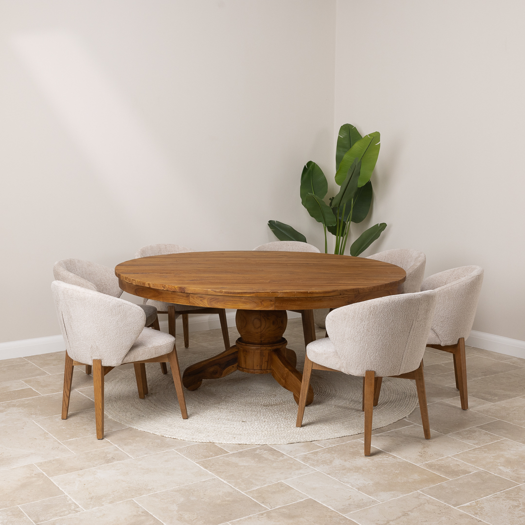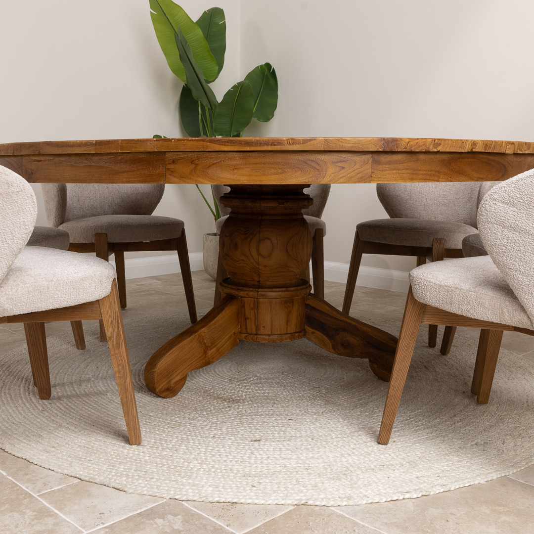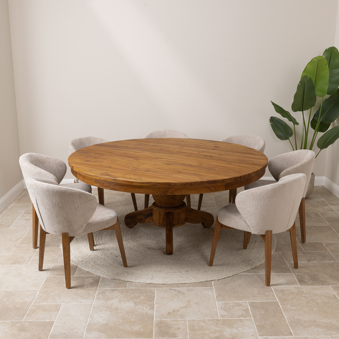 150cm Circular Rustic Reclaimed Teak Pedestal Indoor Dining Table with 6 Upholstered Cove ChairsIn stock